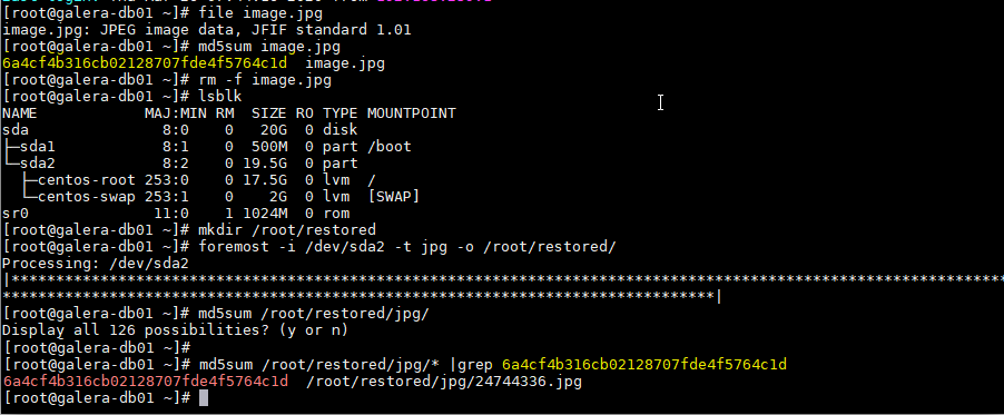 [root@centos7 ~]# foremost -i /dev/sda3 -t jpg -o /root/restored/