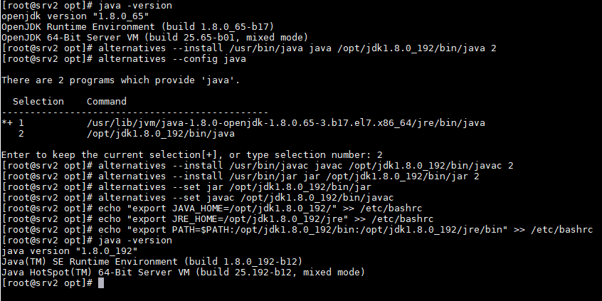 alternatives --install /usr/bin/java java /opt/jdk1.8.0_192/bin/java 2