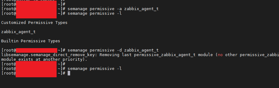 [root@cent7 ~]# semanage permissive -d zabbix_agent_t