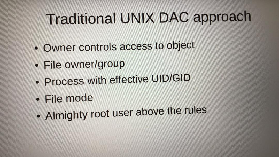 کنترل دسترسی در لینوکس های جاری توسط سیستمی بنام DAC انجام می شود و این سیستم به این صورت است که برای فایلها ، دایرکتوریها یا سوکتها owner و group تعیین می کنید و یکسری دسترسیها (پرمیژنها) به این فایلها می دهید که owner و group بوسیله uid و gid شناخته می شود و پرمیژنها هم با rwx که برای ugo مشخص می شود در نهایت پروسه ها بر حسب اینکه با چه user ایی اجرا می شوند توسط کرنل کنترل می شود که آیا قابلیت دسترسی به فایلها را دارند یا نه!!!